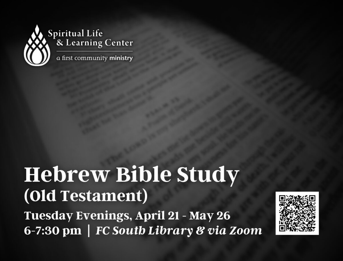 Join the Spiritual Life & Learning Center and facilitators Rev. Karen Chakoian and Rev. Seth Stearns as we explore a foundational knowledge of the Hebrew Bible (Old Testament) through the lens of the theology of First Community. This time focusing on:
